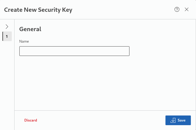 The application also provides a “+ Create” button to create a new security key. The button initiates a wizard for key creation. The following information is required to be entered by the user: