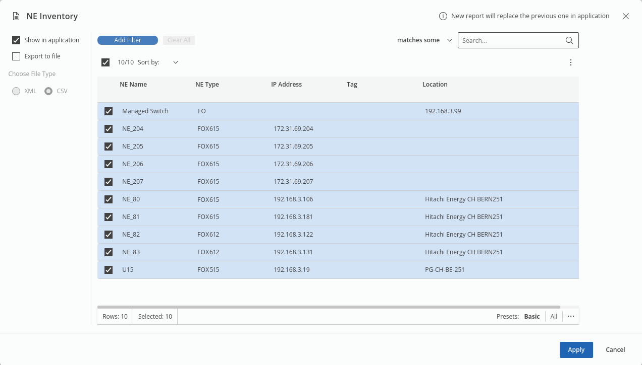 To create an inventory request, select the appropriate tab (NE, Unit, Port, Configuration) and click on “+ Create Inventory Request”. This will open a list of NEs to select from; you can also create a filter to determine the scope of the request. Select where the report shall be generated to: as output in the application (“Show in application”), and/or exported to a file (“Export to file”), either as type CSV or XML. Once the request scope is defined, click on the “Apply” button to create the report.