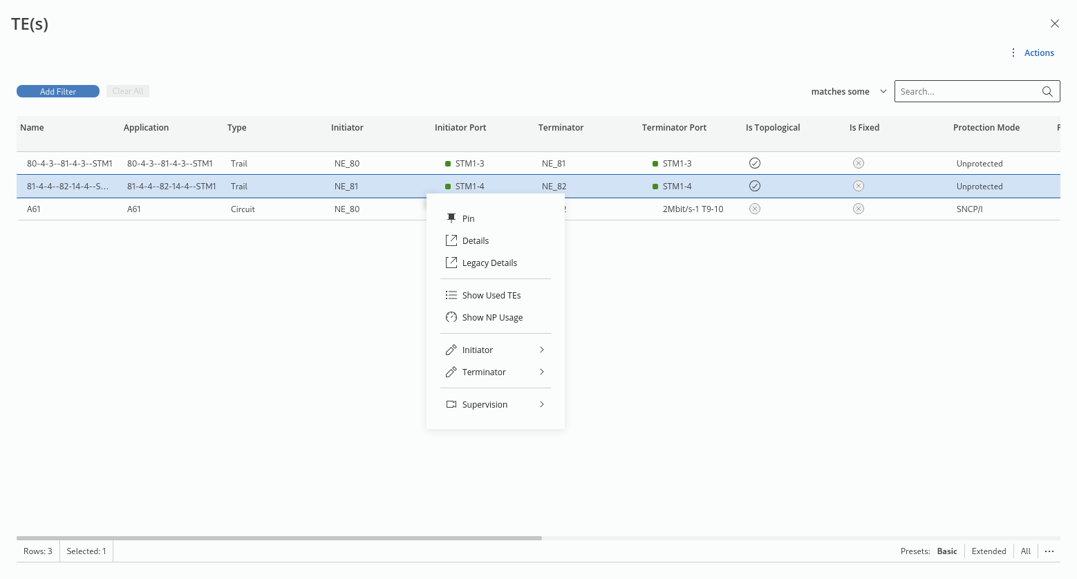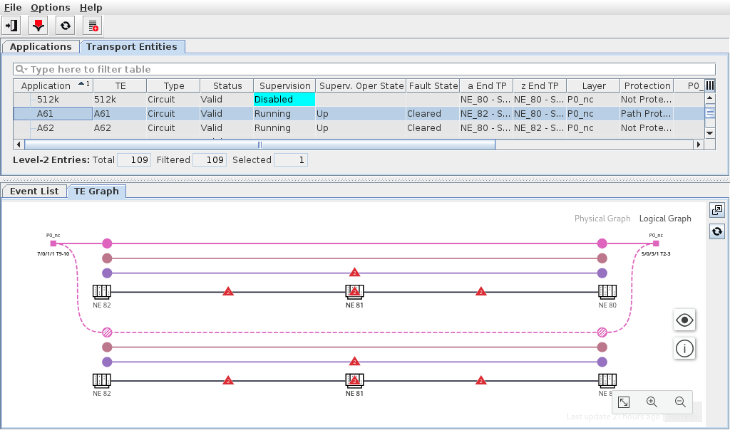 − When expanding “Network Elements”, apart from additional information on the NEs and their used layer rates, the details of TE(s) can be listed via the link icon