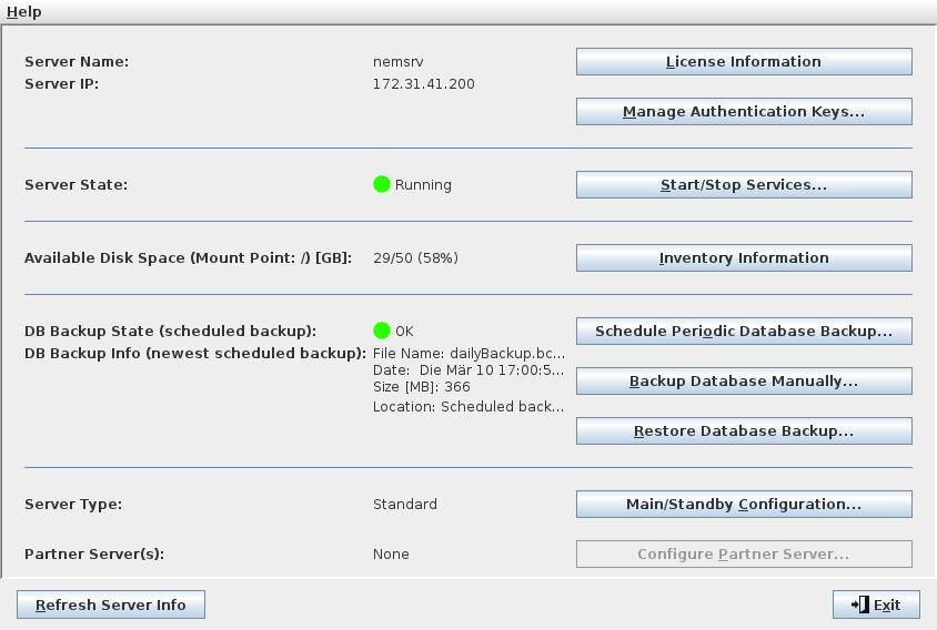 Server Type | Select the Server Type for the server (selected in the Connection Manager). The following server types are available: - Main This is the Main server, operating on the main database, to which the clients normally connect. - Warm Standby This is a Warm Standby server that automatically takes over control when the Main server is not reachable or when its NEM base/core services are not running. The standby server needs to be configured properly and paired with the main server. - Cold Standby This is a Cold Standby server that takes over control after manual start of the NEM services when the Main server is not reachable or when its NEM base/core services are not running. The standby server needs to be configured properly and paired with the Main server. | |
