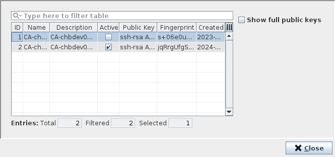 Fingerprint | The authentication key’s fingerprint. As an alternative you can enable “Show full public keys”; in this case the “Public Key” column is enabled which shows the full public key instead of its fingerprint. | |