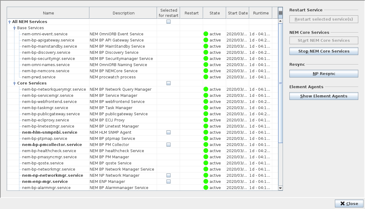 NEM Core Services | - Start NEM Core Services Starts the Core Services listed in the tree under “Core Services”. - Stop NEM Core Services Stops the Core Services listed in the tree under “Core Services”. |