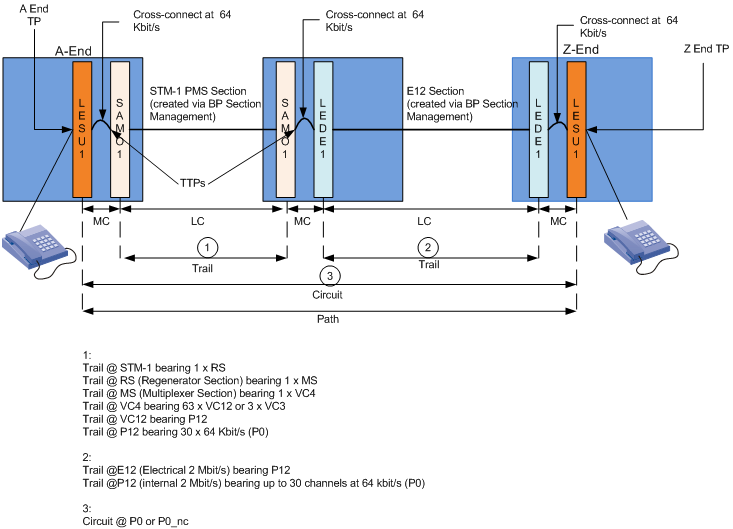 − A bandwidth resource that carries a multiplexed signal from one point to another in the network. The signal is demultiplexed at the extremities (Trail Termination Point, TTP) into points that can be cross-connected with other points in the same NE.