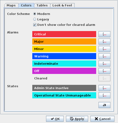 Don’t show color for cleared alarm | If enabled, cleared alarms are shown without color in the alarm lists. If disabled, cleared alarms are shown with the color set in this dialog for the “Cleared” color bar. | |