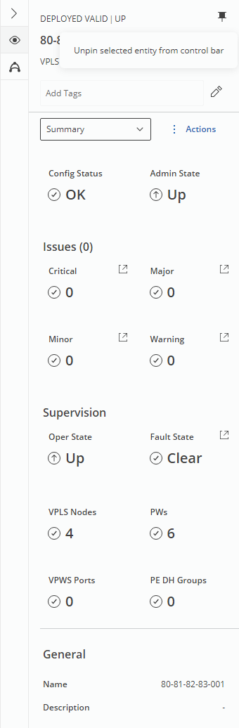 • Header – acting as a title to the details panel. When entity is selected, apart from the name, key status information and type of entity is presented. Moreover, the “pin” icon, that allows pinning or unpinning of the element, is visible.