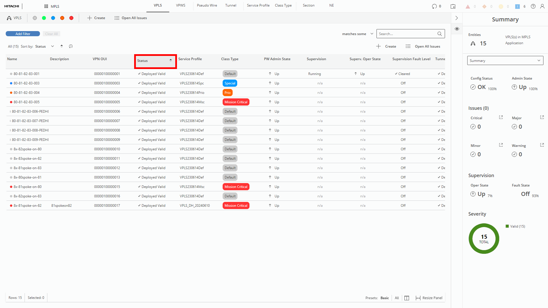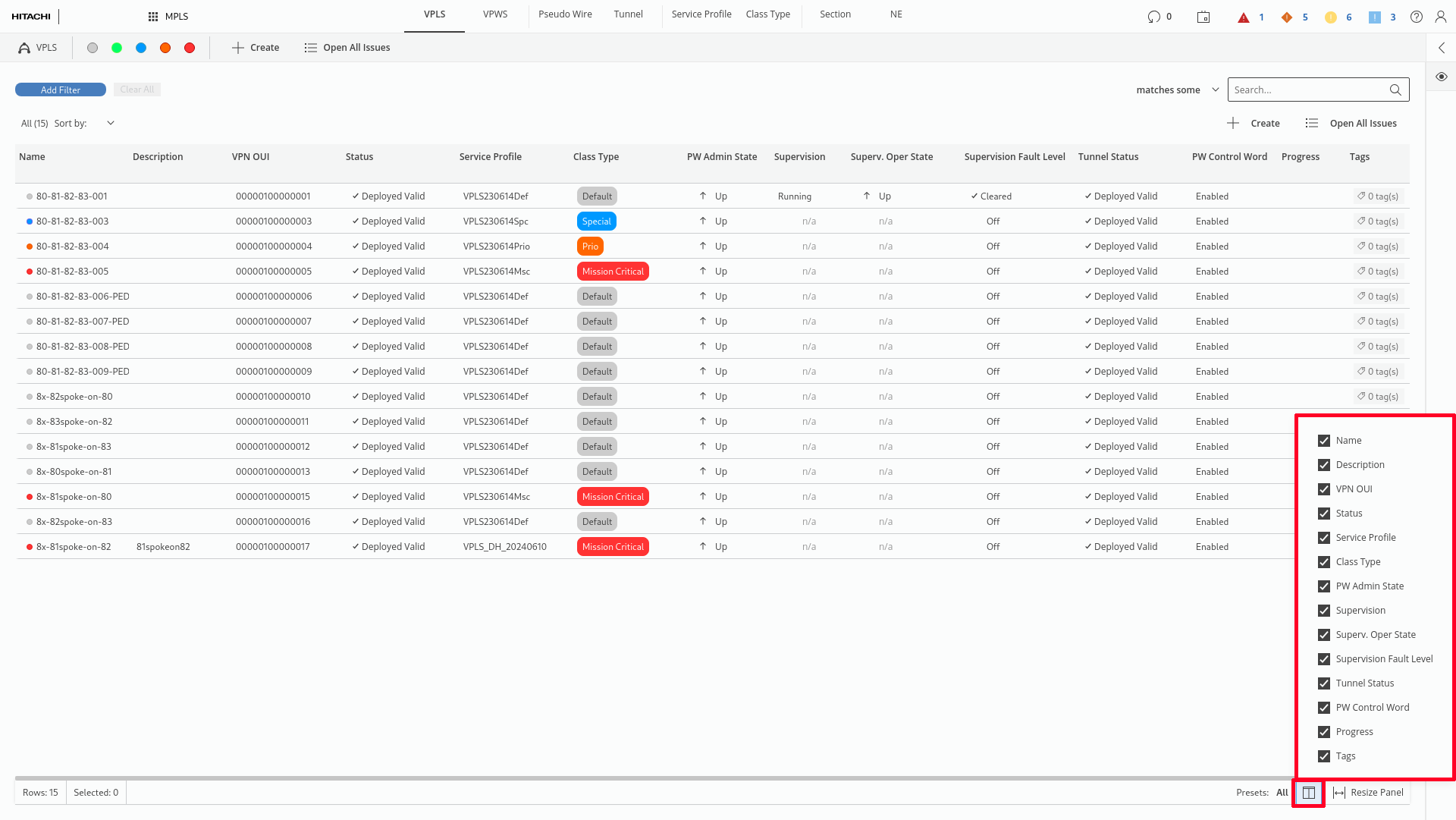 The user can manipulate visibility of the columns by using table column visibility or the table content presets. The applied preset is highlighted by bold font. Table Column Visibility panel list can be accessed by clicking the preset icon.
