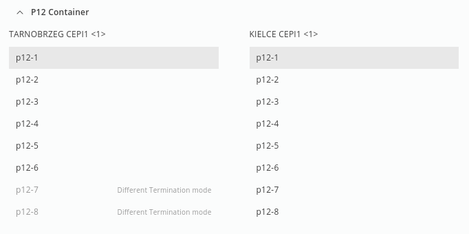 Shows a list of 8 available P12s on Initiator and Terminator CE units. Application selects automatically the first valid option.
