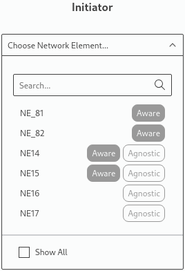 Initiator and Terminator selectors are showing only those NEs which have at least one CE-capable unit, other NEs will not be shown. If required, for information purposes, non-suitable NEs can be included by activating the “Show All” option below the list.