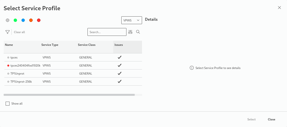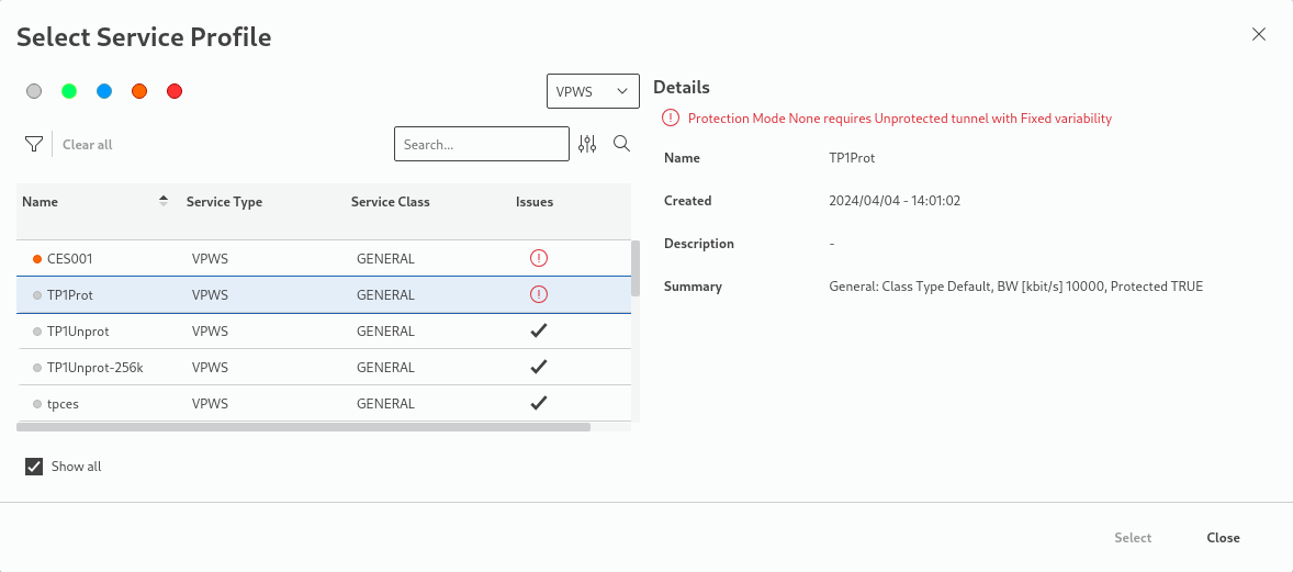 The service profiles can be filtered by class type via a click on the colored dots above the list. Service profiles with issues that prevent a selection can be included in the list by enabling “Show all” below the list. When selecting a service profile with issues, the reason for its non-eligibility is shown in the details area.