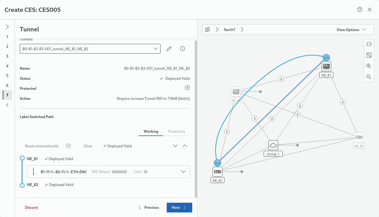 If there already is a proposed tunnel (in status Deployed Valid), the wizard will automatically perform the required actions. Alternatively, you may select a suitable tunnel manually or edit the tunnel to manually correct its properties. Take note of any possible proposed Action, such as, e.g., an increase of the tunnel bandwidth.
