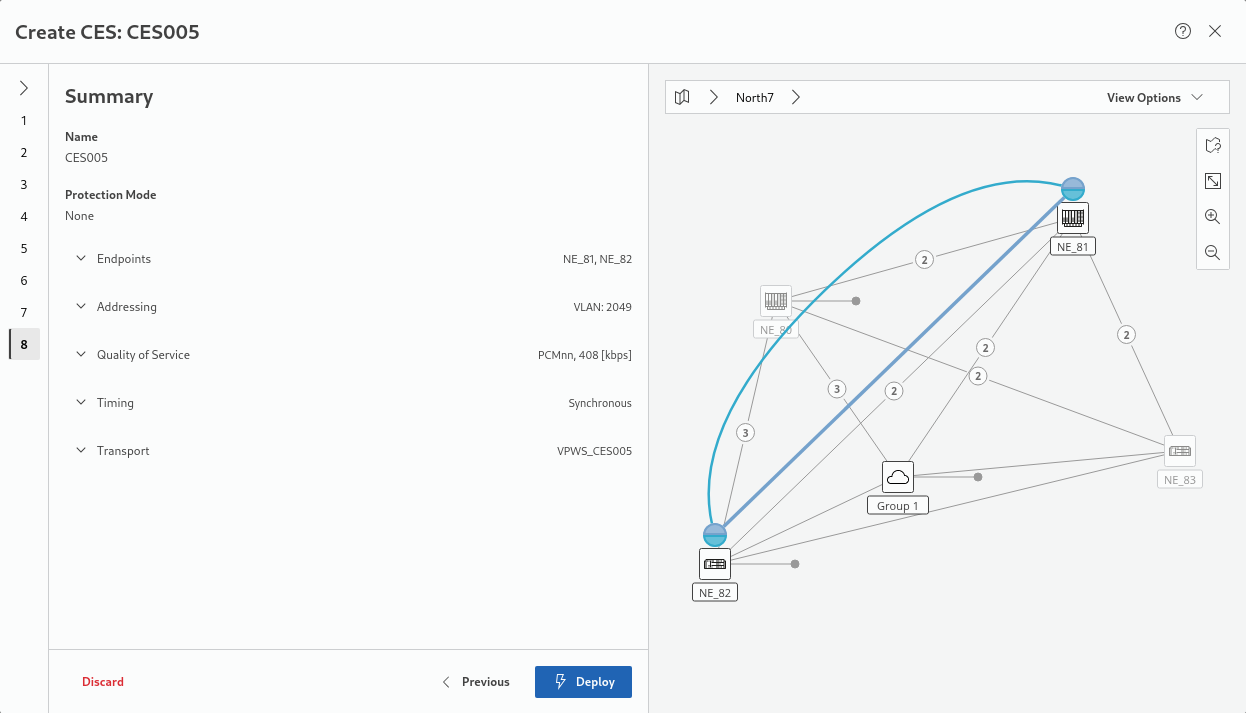 The resulting new service is listed in the Circuit Emulation Services overview table as soon as the service has been deployed and discovered from the network.